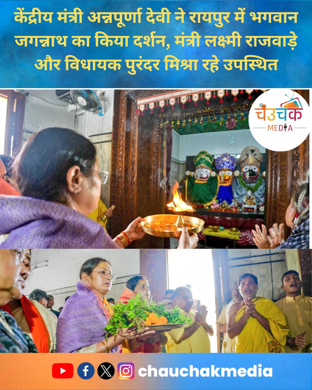 केंद्रीय मंत्री अन्नपूर्णा देवी ने रायपुर में भगवान जगन्नाथ का किया दर्शन, मंत्री लक्ष्मी राजवाड़े और विधायक पुरंदर मिश्रा रहे उपस्थित