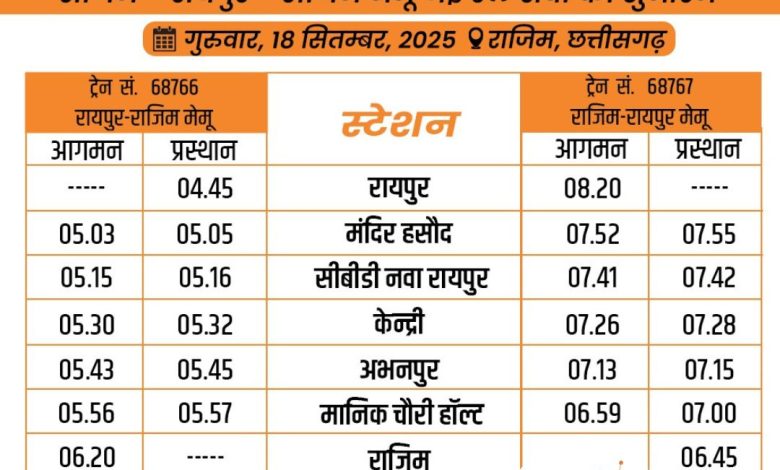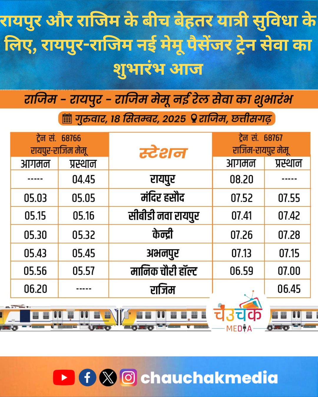 रायपुर और राजिम के बीच बेहतर यात्री सुविधा के लिए, रायपुर-राजिम नई मेमू पैसेंजर ट्रेन सेवा का शुभारंभ आज