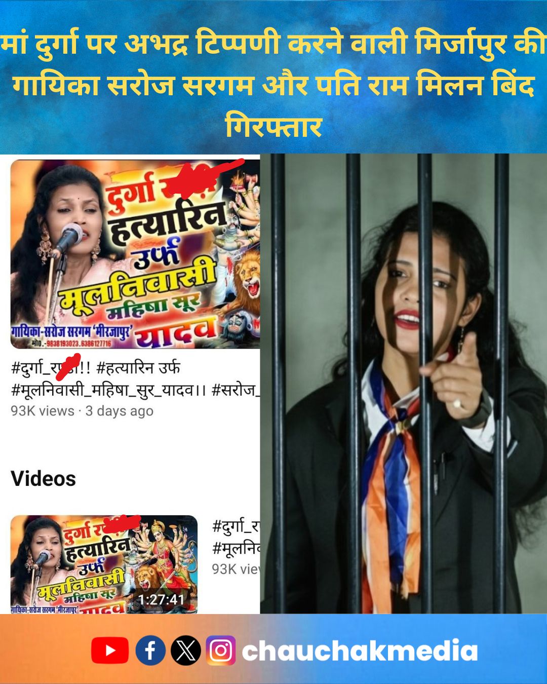 मां दुर्गा पर अभद्र टिप्पणी करने वाली मिर्जापुर की गायिका सरोज सरगम और पति राम मिलन बिंद गिरफ्तार