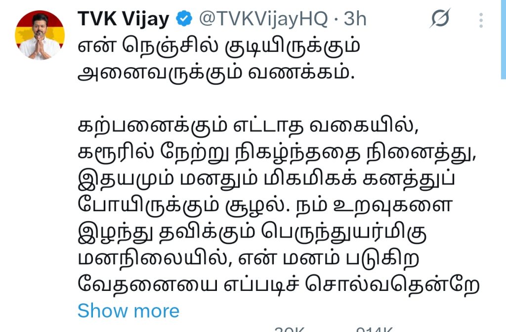 கற்பனைக்கும் எட்டாத வகையில், கரூரில் நேற்று நிகழ்ந்ததை நினைத்து, இதயமும் மனதும் மிகமிகக் கனத்துப் போயிருக்கும் சூழல். நம் உறவுகளை இழந்து தவிக்கும் பெருந்துயர்மிகு மனநிலையில், என் மனம் படுகிற வேதனையை எப்படிச் சொல்வதென்றே…