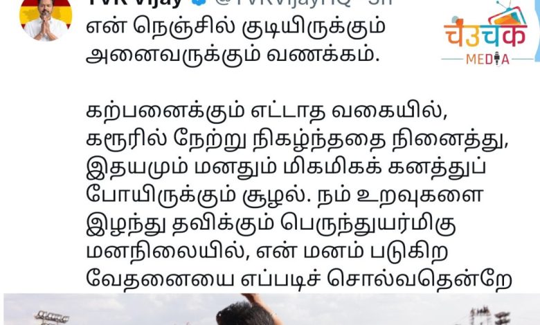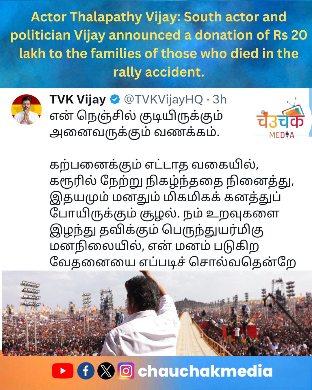 साउथ एक्टर और राजनेता विजय (Vijay) की शनिवार को तमिलनाडु के करूर में रैली थी. विजय की पार्टी तमिलगा वेत्त्री कझगम की इस रैली के दौरान भगदड़ मच गई और 39 लोगों की जान चल गई. वहीं, इस हादसे में करीब 100 से लोग घायल हो गए. इस हादसे से देश भर में लोगों को आहत कर दिया. विजय ने भी सोशल मीडिया के जरिए इस हादसे पर दुख जताया था. वहीं, अब एक्टर ने मृतकों के परिवारों की आर्थिक मदद करने की घोषणा की है. विजय ने लेटेस्ट ट्वीट में बताया है कि उनकी तरफ से 20 लाख रुपये दिए जाएंगे. इसके साथ ही घायलों के फैमिली को भी सहायता राशि दी जाएगी.