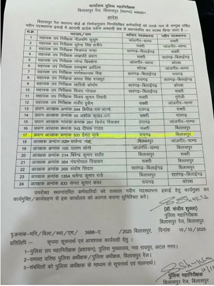 बता दें कि, आदेश के तहत पुलिसकर्मियों को एक जिले से दूसरे जिले तैनात किया गया है, जिन्हें तत्काल रिलीव कर ज्वाइनिंग के निर्देश जारी किए गए है।