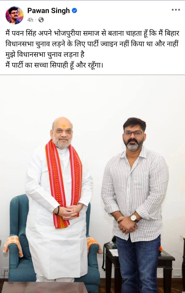 “मैं, पवन सिंह, अपने भोजपुरीया समाज से कहना चाहता हूँ कि मैंने बिहार विधानसभा चुनाव लड़ने के लिए पार्टी जॉइन नहीं की थी और ना ही मुझे विधानसभा चुनाव लड़ना है। मैं पार्टी का सच्चा सिपाही था, हूँ और रहूँगा।”