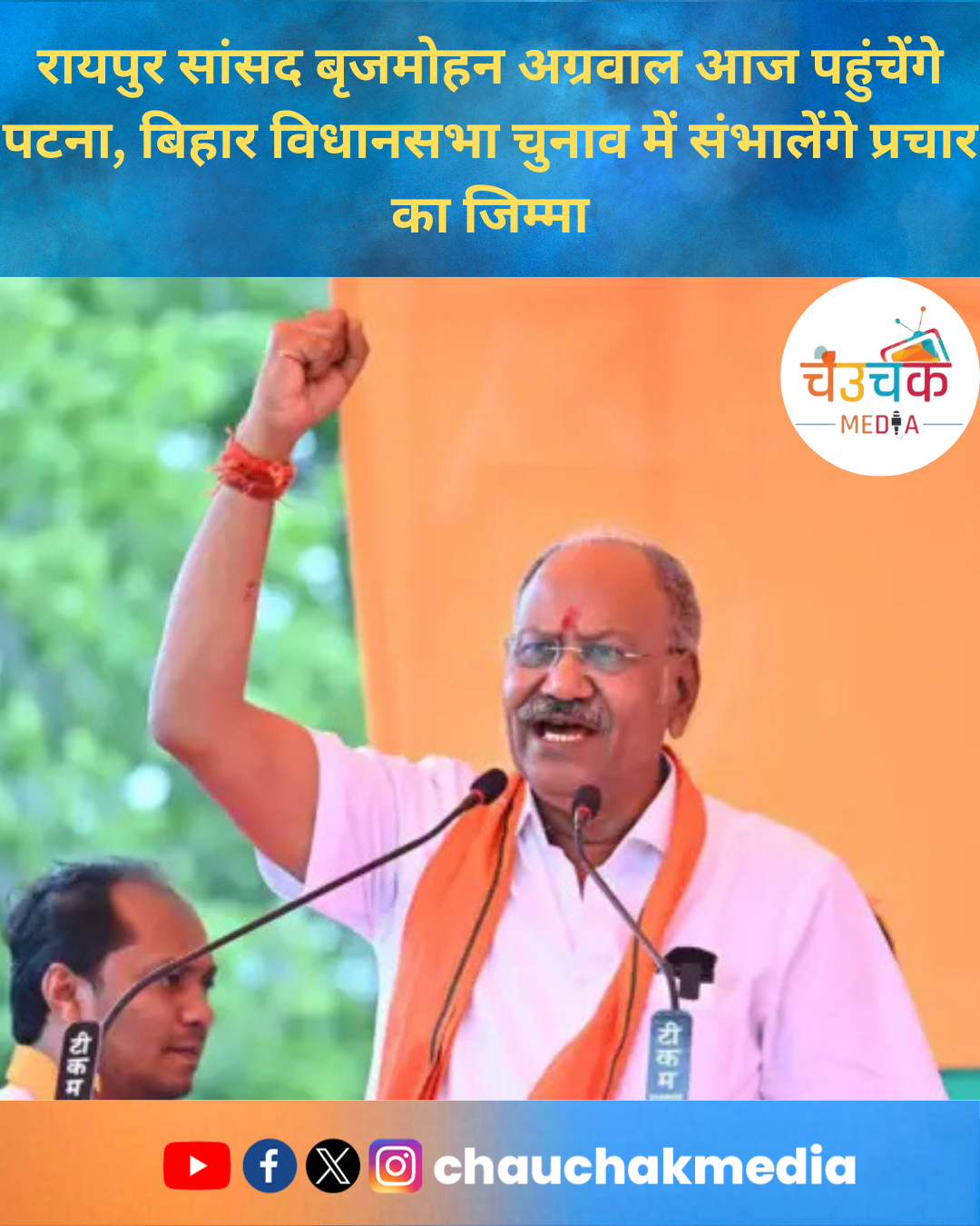 रायपुर सांसद बृजमोहन अग्रवाल आज पहुंचेंगे पटना, बिहार विधानसभा चुनाव में संभालेंगे प्रचार का जिम्मा