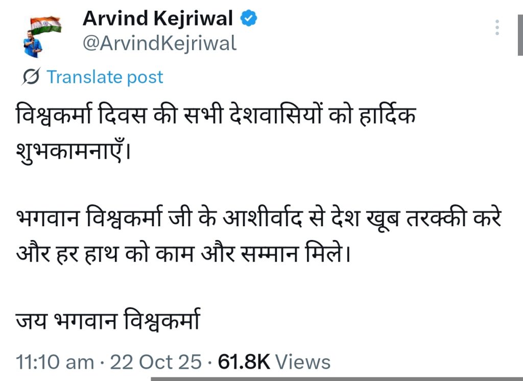 केजरीवाल के ट्वीट में लिखा था, “विश्वकर्मा दिवस की सभी देशवासियों को हार्दिक शुभकामनाएँ। भगवान विश्वकर्मा जी के आशीर्वाद से देश खूब तरक्की करे और हर हाथ को काम और सम्मान मिले। जय भगवान विश्वकर्मा।”