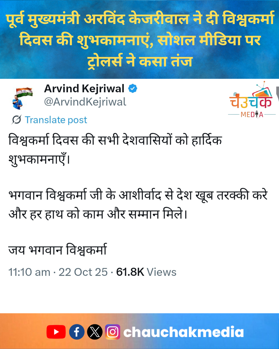 बता दें, विश्वकर्मा दिवस तो 17 सितंबर 2025 को मनाया गया था, जबकि आज 22 अक्टूबर को गोवर्धन पूजा (अन्नकूट) का पर्व है, जो भगवान कृष्ण को समर्पित है। केजरीवाल के इस पोस्ट ने सोशल मीडिया पर तहलका मचा दिया। यूजर्स ने जमकर तंज कसा और सवाल उठाया।