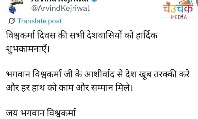केजरीवाल के ट्वीट में लिखा था, “विश्वकर्मा दिवस की सभी देशवासियों को हार्दिक शुभकामनाएँ। भगवान विश्वकर्मा जी के आशीर्वाद से देश खूब तरक्की करे और हर हाथ को काम और सम्मान मिले। जय भगवान विश्वकर्मा।”